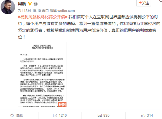 正確的話反復(fù)說,是公關(guān)傳播的基礎(chǔ),無論是日常傳播還是危機(jī)管理,無論正面還是負(fù)面,無論高潮或低估,不忘企業(yè)初心,讓各界時(shí)時(shí)感受到企業(yè)的價(jià)值觀、宏圖偉志、美好未來。在這一點(diǎn)上,易到讓競(jìng)爭(zhēng)段子成為了“笑話”。 六、挑戰(zhàn)大象:致騰訊信一舉成名 相信不少人對(duì)易到印象的改觀來自于“周航致馬化騰的公開信《弱者也有權(quán)利發(fā)聲》”,此前一直蒙頭實(shí)干,不撕逼,不論戰(zhàn)的老實(shí)人易到,一下子讓人感受到易到也是有性格的、有底線的,也“不好惹”!